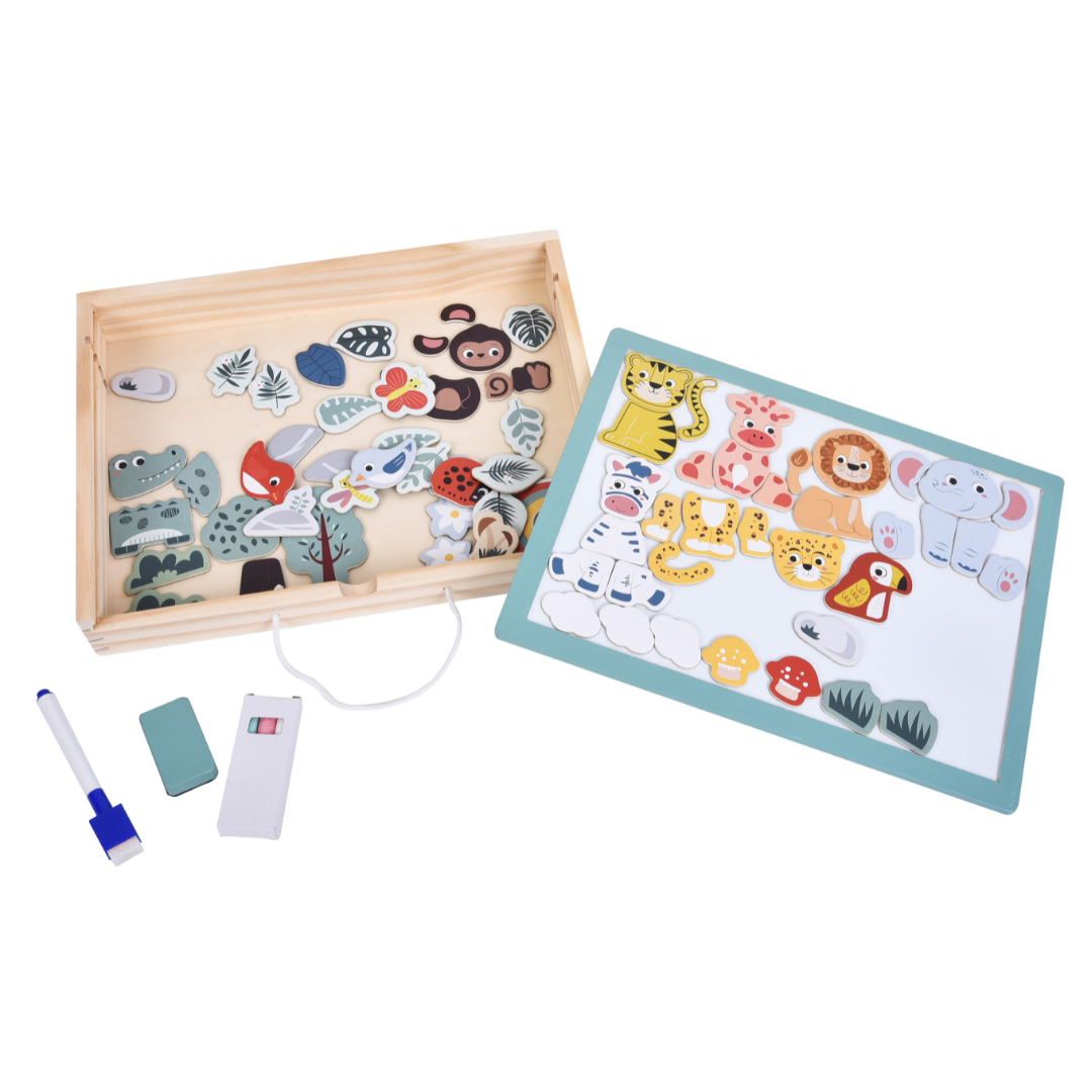 Medfølgende jungledyrsmagneter kan samles til rigtige dyr eller fantasifulde fabeldyr og kassen leveres med tavlekridt, whiteboard-pen og en lille tavlesvamp, så barnet kan tegne, skrive og eksperimentere igen og igen. Den praktiske snøre-hank gør kassen nem at tage med på weekend- og ferieture. Så underholdningen altid er lige ved hånden.