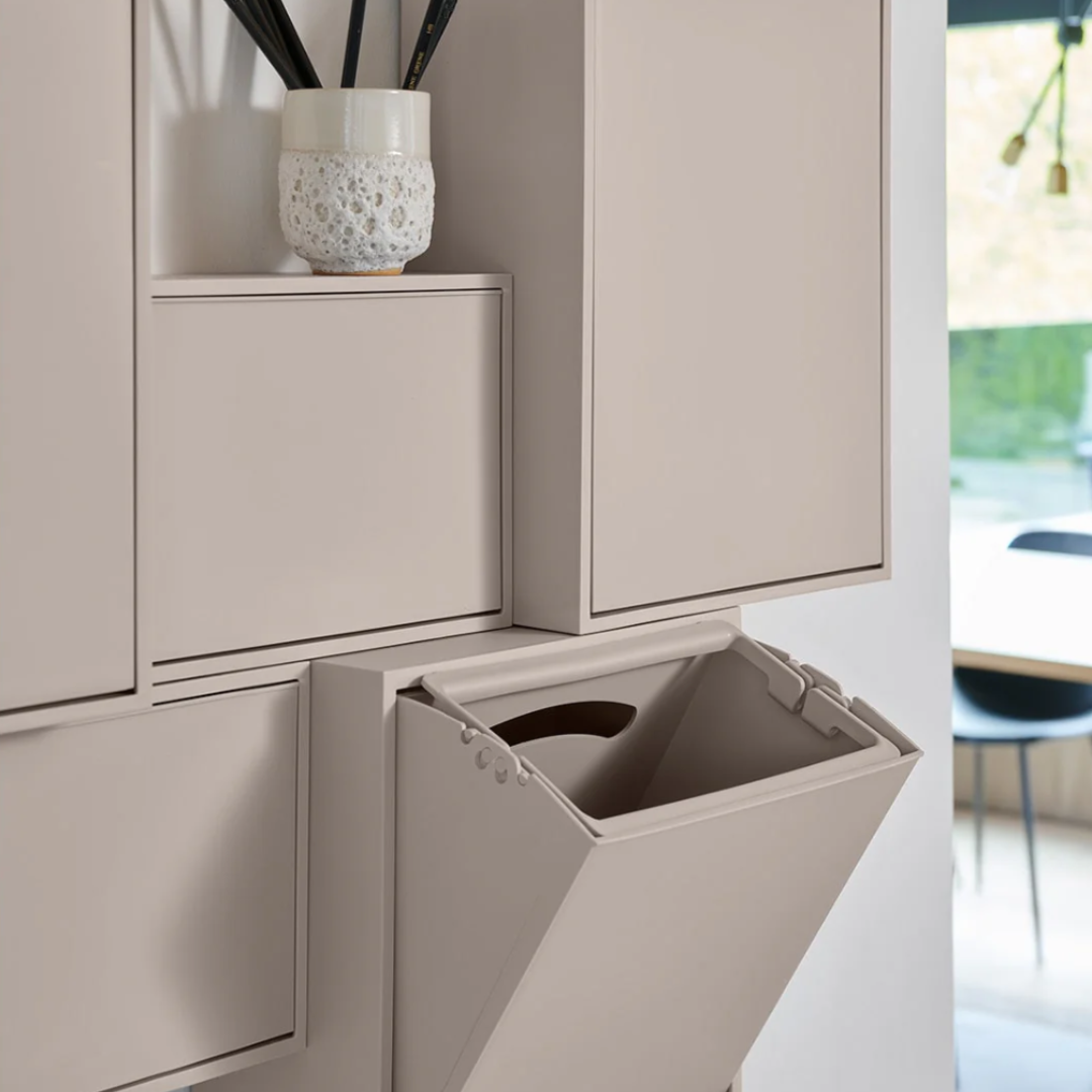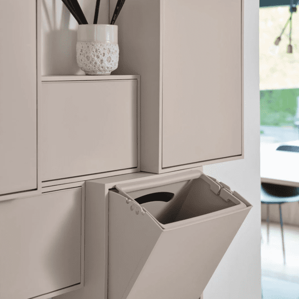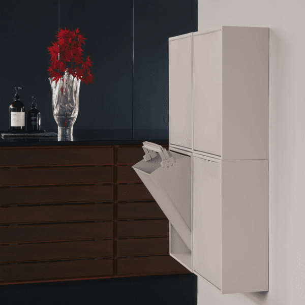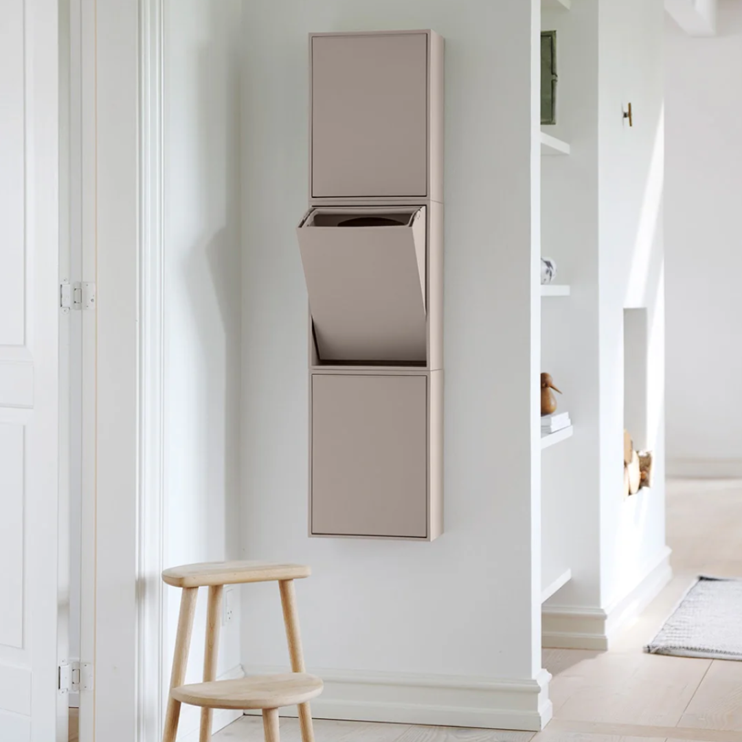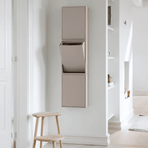 Dette design er enkelt, praktisk og flot. Med blot 15 cm i dybden for du en væghængt sorteringsløsning, som ikke fylder meget ud i rummet. Hvilket betyder at den blot kan bruges mange steder i indretningen. Monter den i køkken, bryggers eller depot og gør det nemmere at sortere dit affald i en travl hverdag.