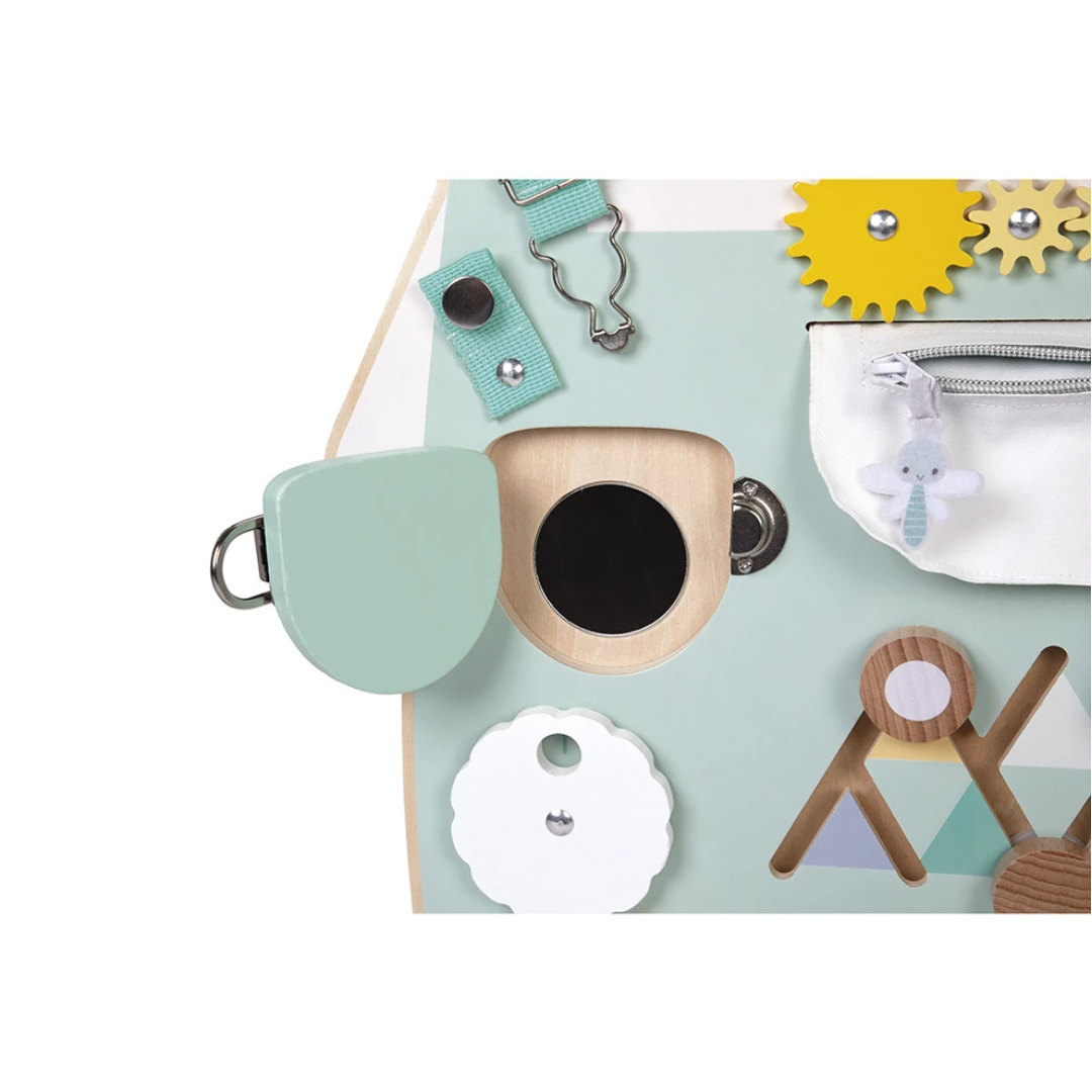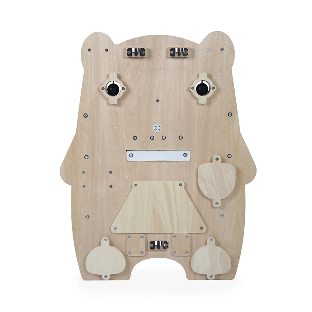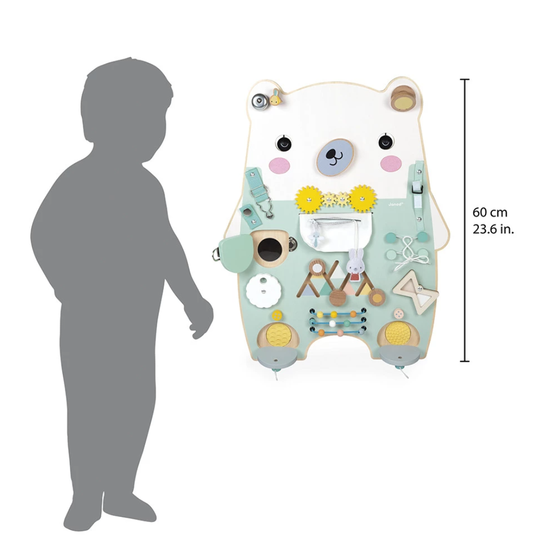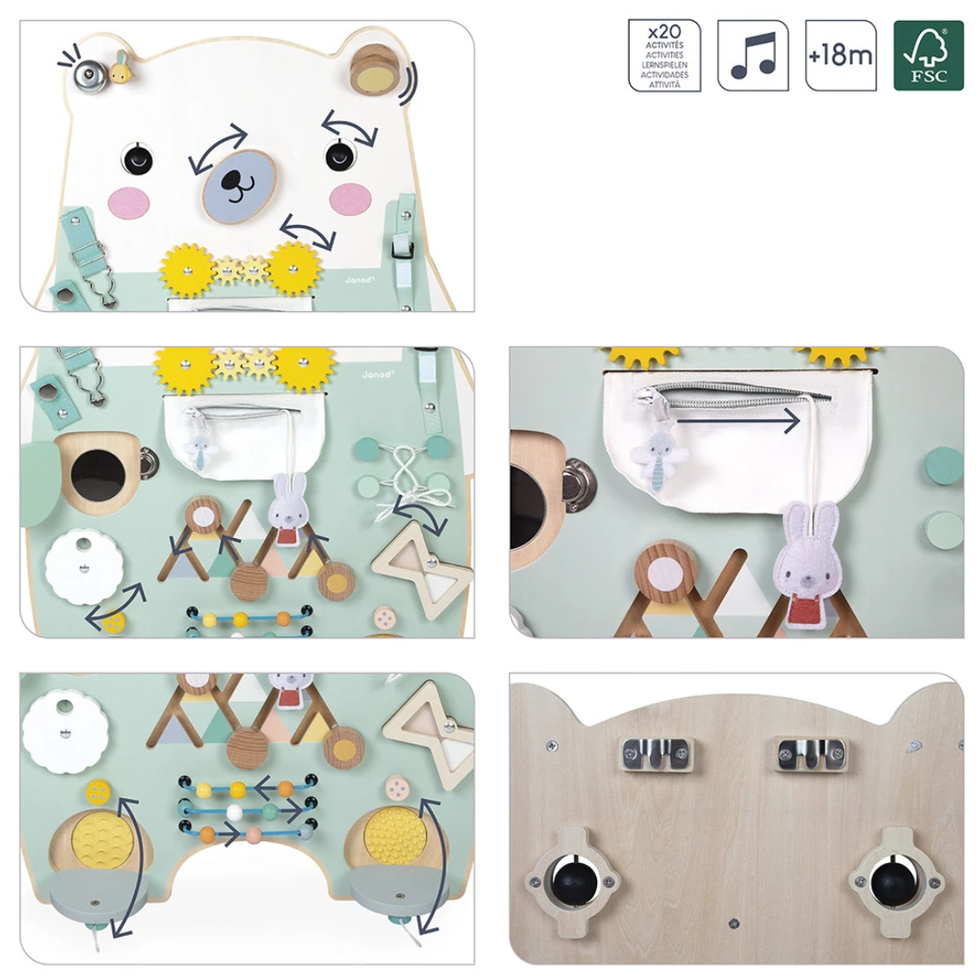 Janod | Bear aktivitetstavle er et charmerende og alsidigt trælegetøj, designet til børn fra 18 måneder og opefter. Med sit søde bjørnedesign og bløde, beroligende farver passer det perfekt ind i ethvert børneværelse eller legerum.