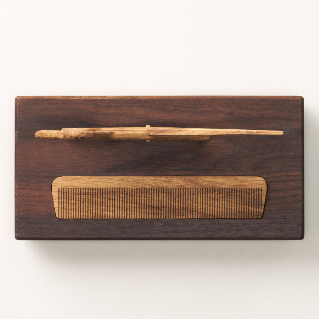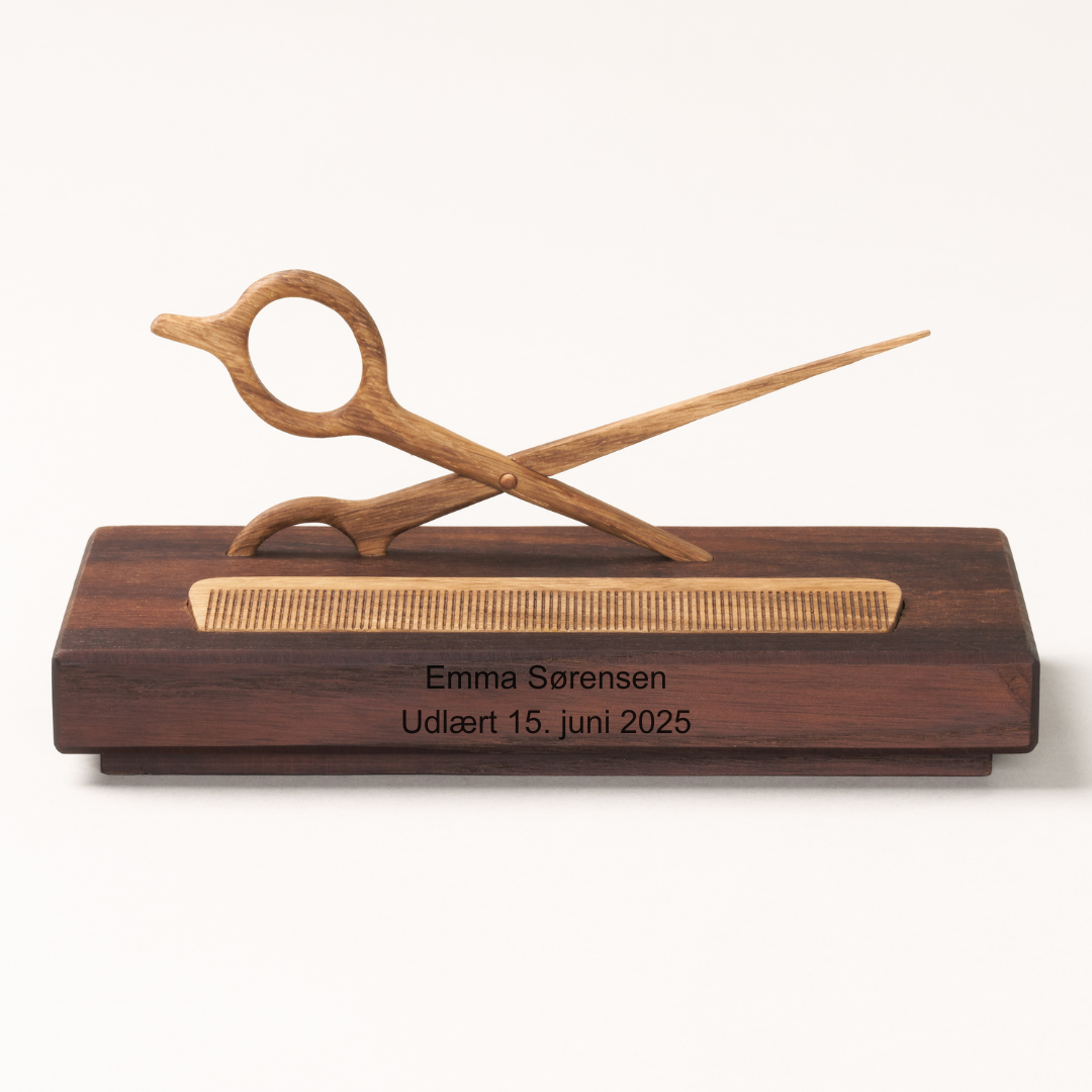 Skulpturen er udført i kvalitetstræ af eg og ask, og det fine håndværk ses tydeligt i de detaljerede udskæringer af saks og kam, der ligger smukt indfattet i en mørk plade. Designet emmer af elegance og dansk håndværkstradition – et ægte symbol på faglig stolthed.