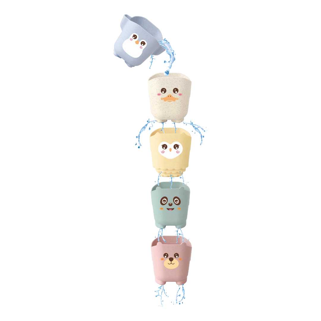 Gør badetiden endnu sjovere med disse fem søde krus fra Kinder and Kids. Sættet indeholder motiver af pingvin, and, ugle, panda og bjørn – alle med små huller i bunden, så vandet kan løbe igennem.