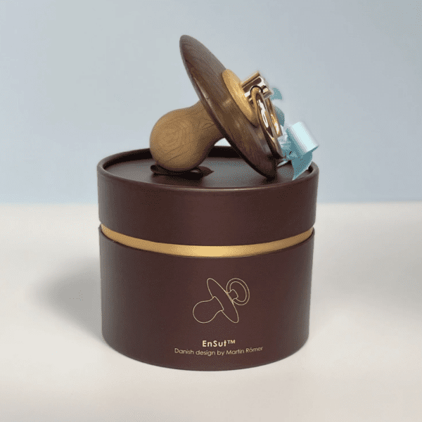 EnSut™ er designet af Martin Römer fra Römer Design. EnSut™ er en elegant kombination af flotte materialer og enkelt design. Den er designet til at være en skøn gaveide til flere anledninger, uanset om det skal være til barnedåbsfesten eller navngivningsfesten. Denne udgave leveret med et blåt bånd og henvender sig til drengebørn.