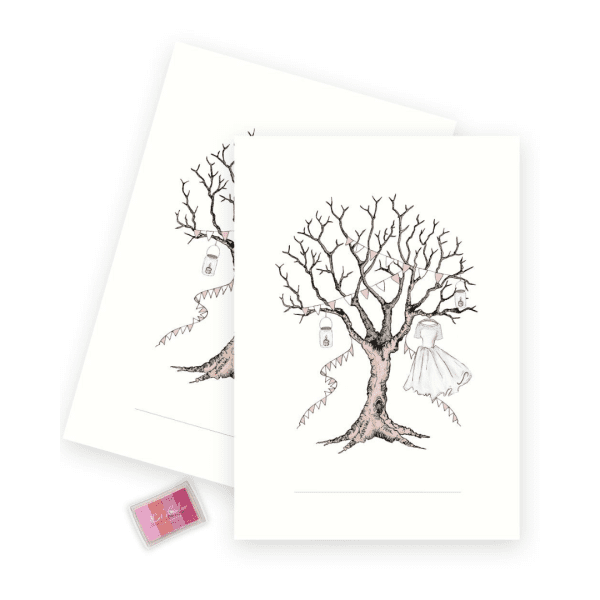 Derudover består sættet også af en stempelpude med fire forskellige nuancer af grøn, der skaber et fantastisk farvespil, når alle gæsterne sætter deres aftryk som blade, der skal danne en smuk trækrone. Indeni bladene kan du med fordel skrive gæsternes navne eller initialer.