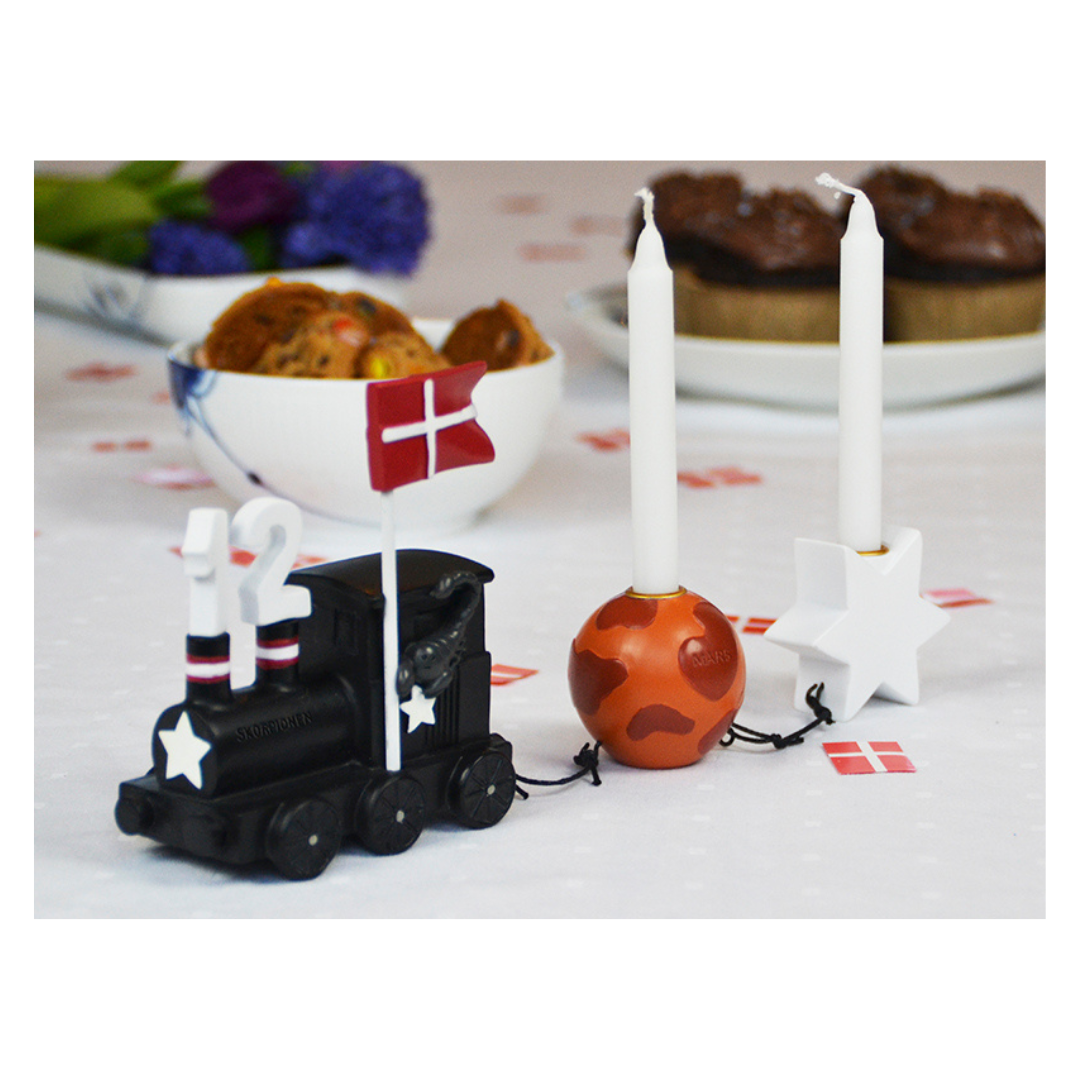 Togets figurer samles nemt med de medfølgende små snore. Der er plads til to stearinlys i planeten og stjernen, mens tallene og flaget kan placeres på toget, så barnets alder markeres år efter år.