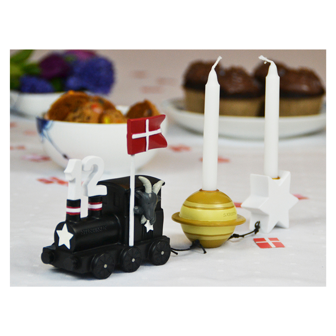 Figurerne samles nemt med de medfølgende små snore. Toget har plads til to stearinlys – ét i stjernen og ét i planeten – mens tallene og flaget placeres på toget, så barnets alder markeres på ny hvert år.
