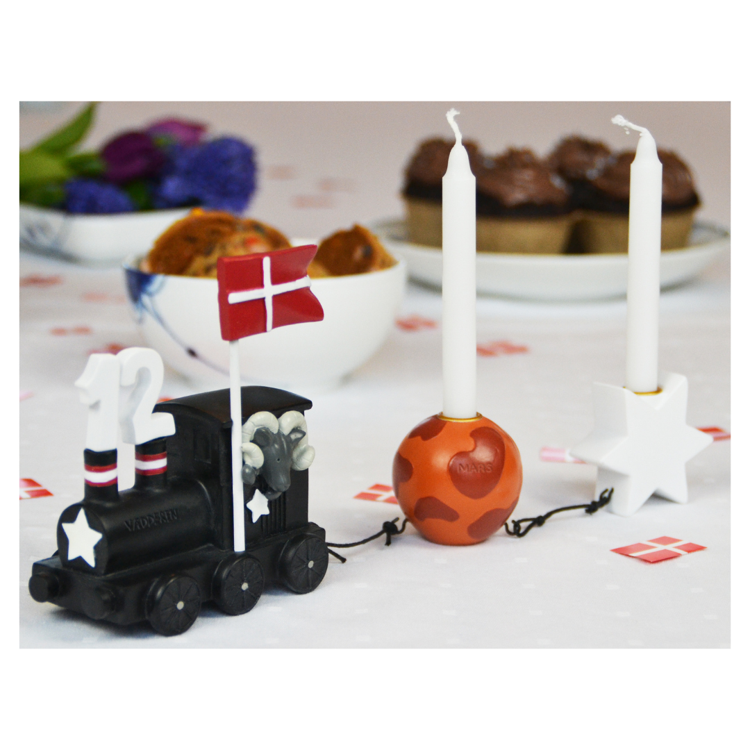 Figurerne samles nemt med de medfølgende små snore. Toget har plads til to stearinlys i stjernen og planeten, mens tallene og flaget placeres på lokomotivet, så barnets alder kan markeres år efter år.