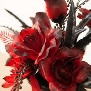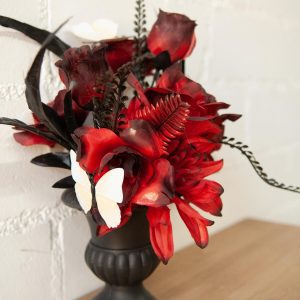 Ekstravagant, uhyggeligt smuk, nobel eller simpelthen anderledes er, hvordan den kunstige blomsterbuket præsenterer sig selv. Den er harmonisk arrangeret i en mat sort vase og er fleksibel i brug – ikke kun til Halloween. To-tone roser i rød med en sort kant danner midten af arrangementet. Deres tekstil blomsterhoveder er åbne i forskellige bredder og gradueret i højde. Dermed er farvesammensætningen især godt fremhævet. Den dekorative buket er indrammet af forskellige løv i sort. Som kontrast til den rød-sorte dekorationsgenstand er der tilføjet tre sommerfugle i farverne hvid og beige. Ved levering er blomsterdekorationen allerede sat i den sorte plastikvase på styrofoam og klar til at blive placeret.