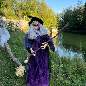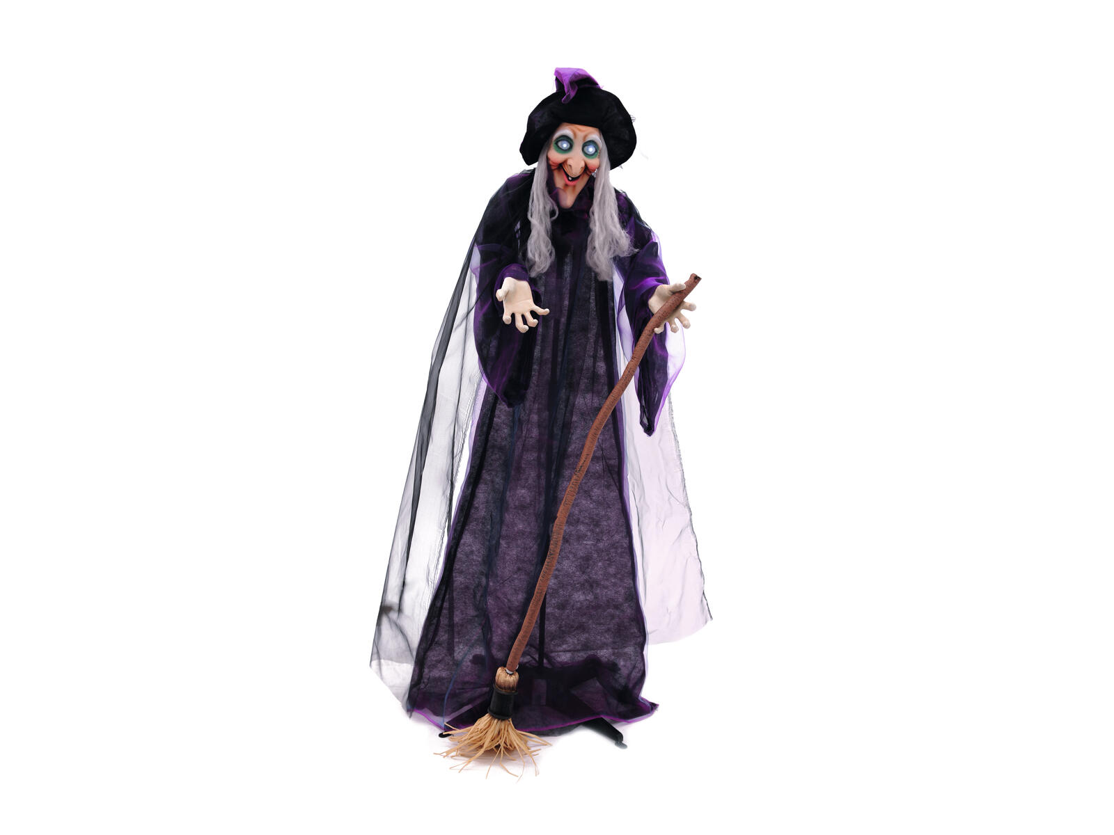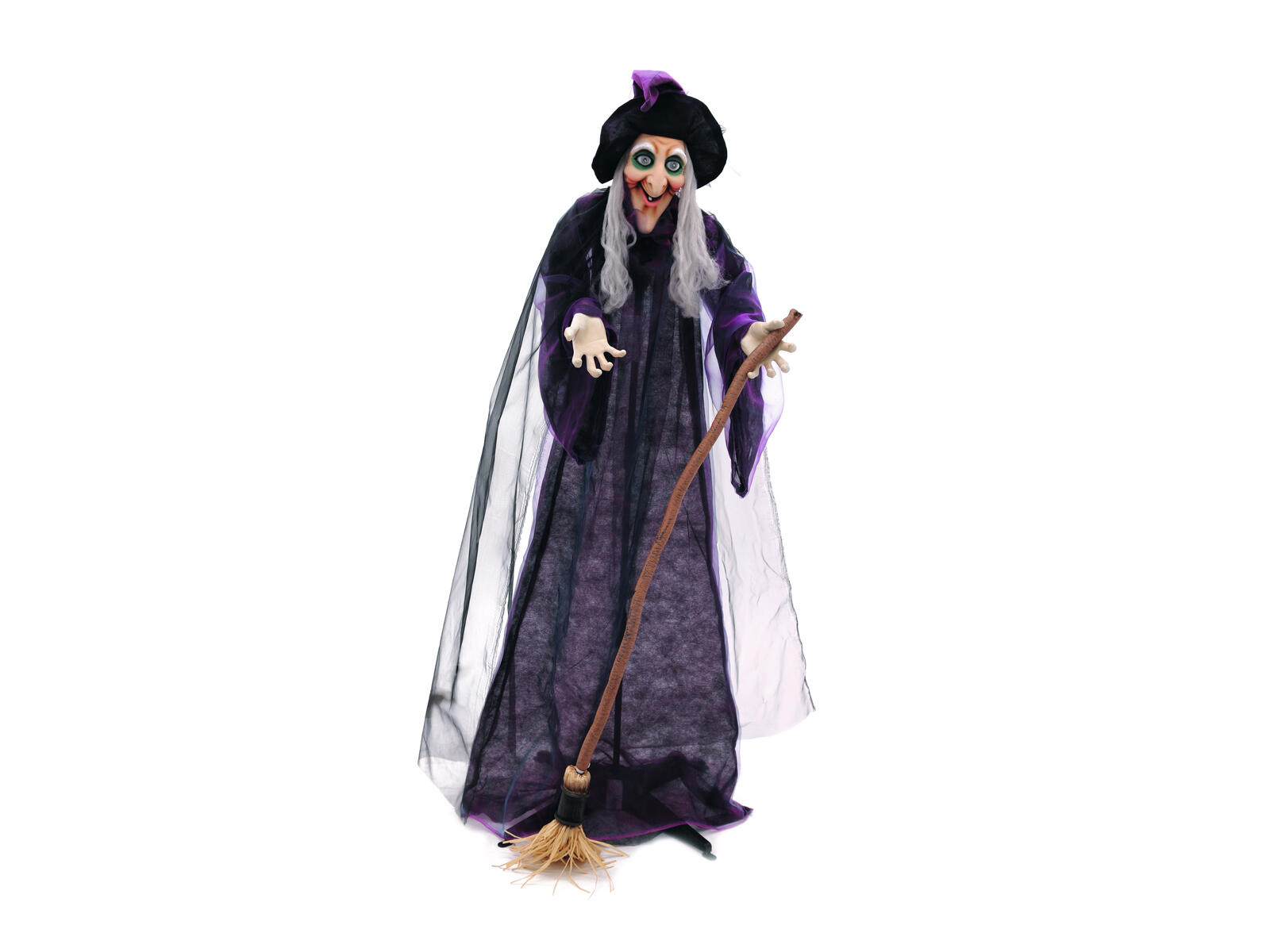 Gør halloween ekstra uhyggelig med denne stående heks med kost. Figuren har blinkende hvide øjne, lydeffekter og en krop, der bevæger sig for en skræmmende effekt. Med en animationstid på op til 16 sekunder skaber den en levende og stemningsfuld oplevelse, der passer perfekt til halloweenfesten eller som dekoration ved indgangen.