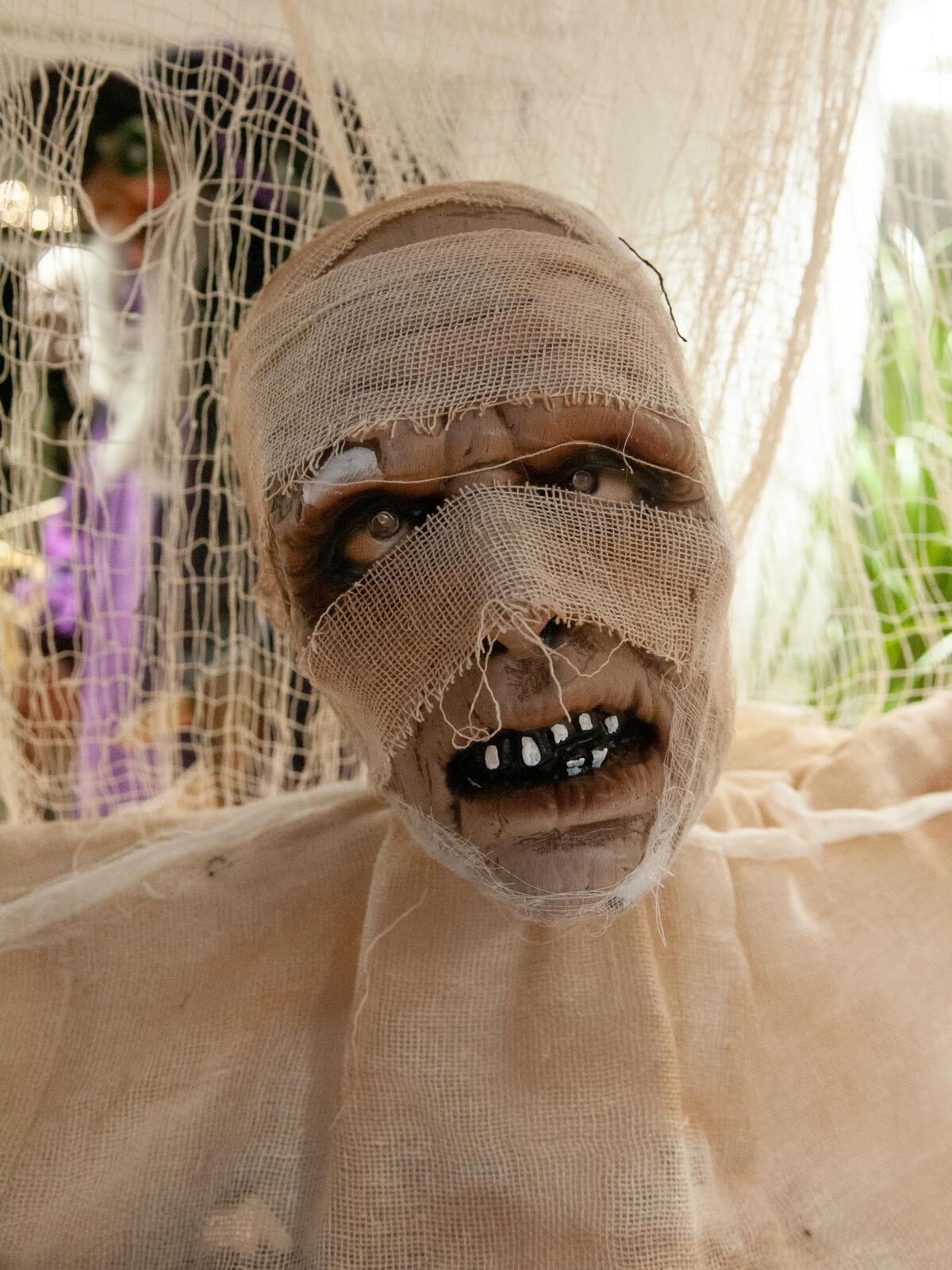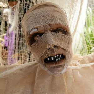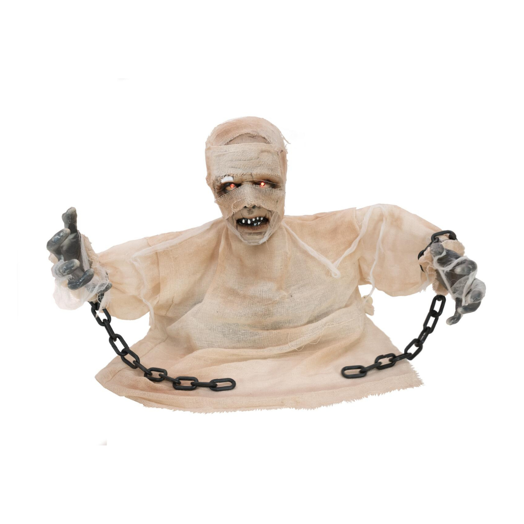 Skab den helt rigtige creepy stemning til Halloween med denne Halloween Mumien. Den delvist opsvulmende mumie, indhyllet i gaze, ser ud til at være på vej op fra sin grav og vil med garanti give dine gæster kuldegysninger.