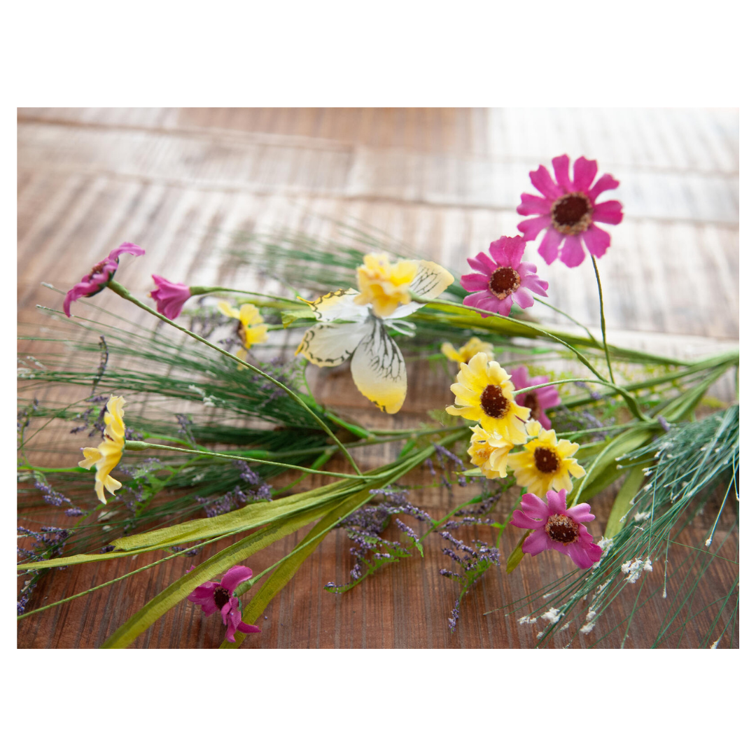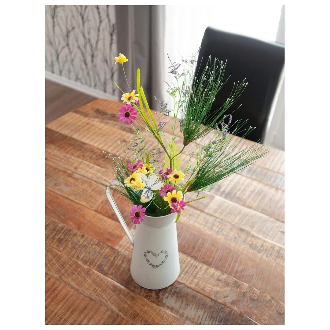 Skab et farverigt og naturligt udtryk i indretningen med denne kunstige vildblomst gren på 60 cm. Grenen består af en smuk blanding af vilde engblomster og græsser, herunder svingelgræs og verbena, som giver et let og levende look.