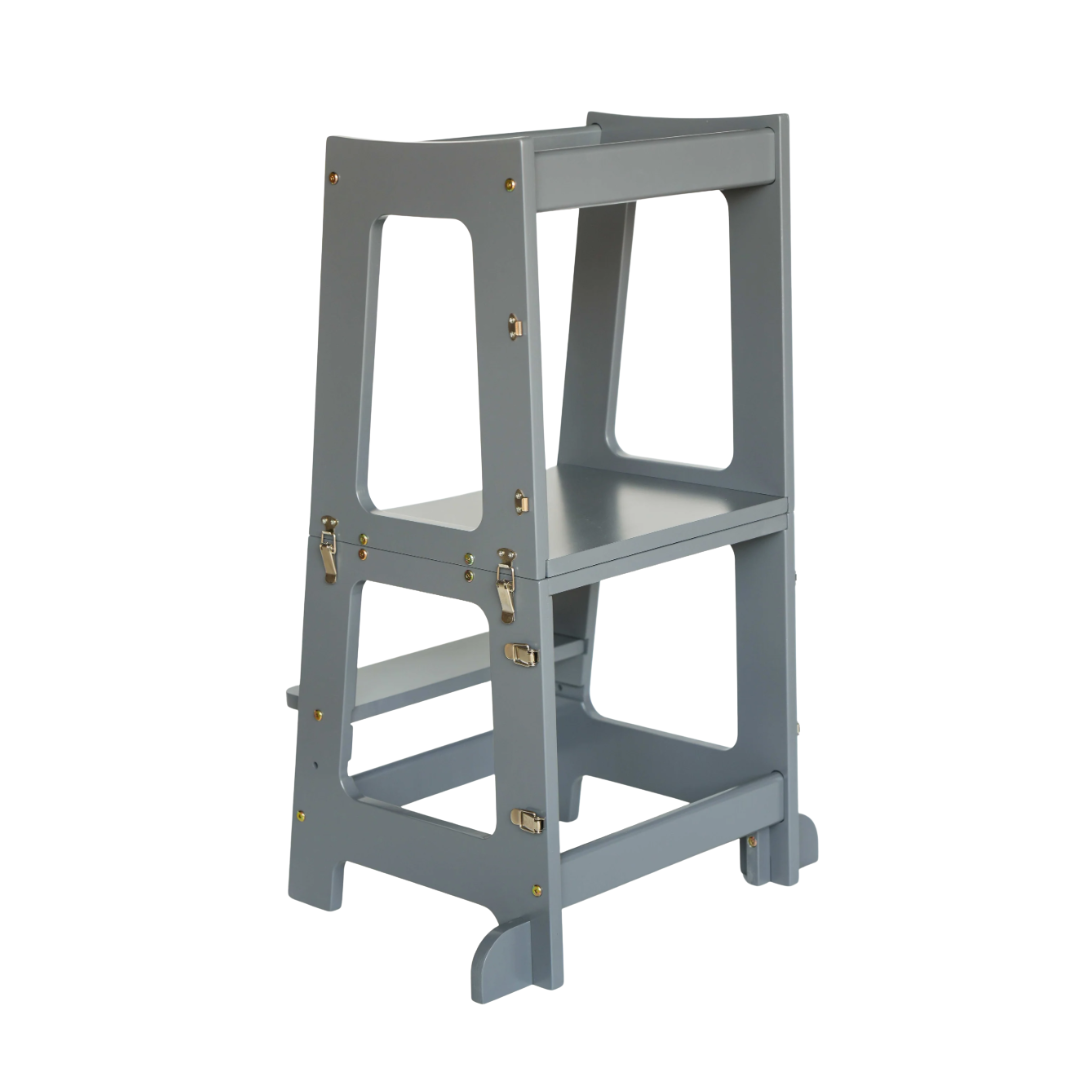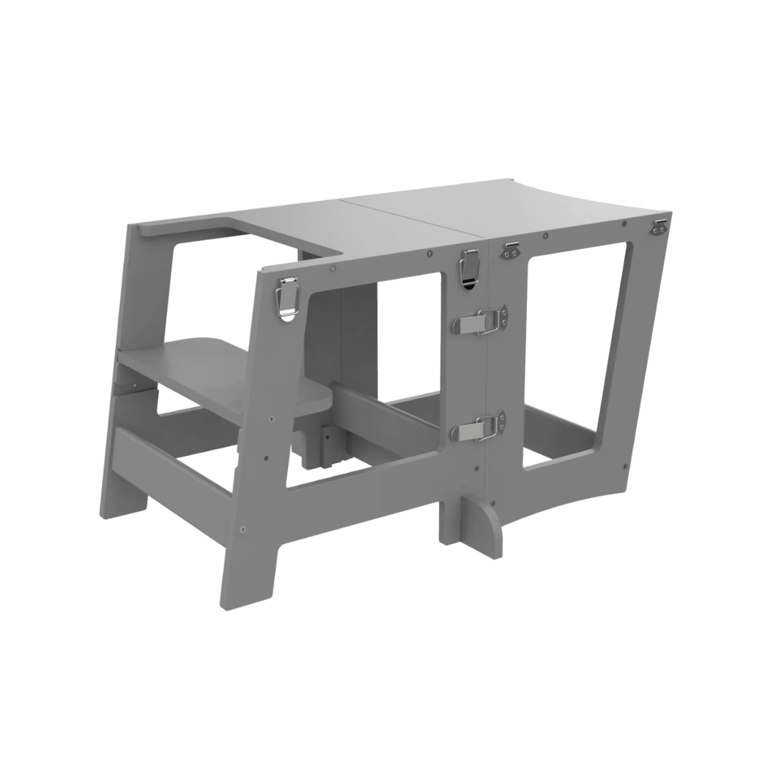Maya læringstårn er et foldbart tårn skabt til at være en hjælp i køkkenet eller som en ekstra kreativ plads til barnet. Tårnet kan nemlig omdannes til en selvstændig skammel til de større børn, så du sikre en tryg og stabil skammel for dit barn. En perfekt møbel til dig som gerne vil have dit barn med i dagligdages gøremål, som eksempelvis under madlavningen, når vasketøjet skal foldes eller andre praktiske opgaver. Mens barnet er mindre og ikke er stabil på fødderne endnu, kan dette børnemøbel bruges som bord og stol. Maya læringstårn er designet med et smart og innovativ kliksystem, så den nemt kan samles og justeres – alt efter behov.