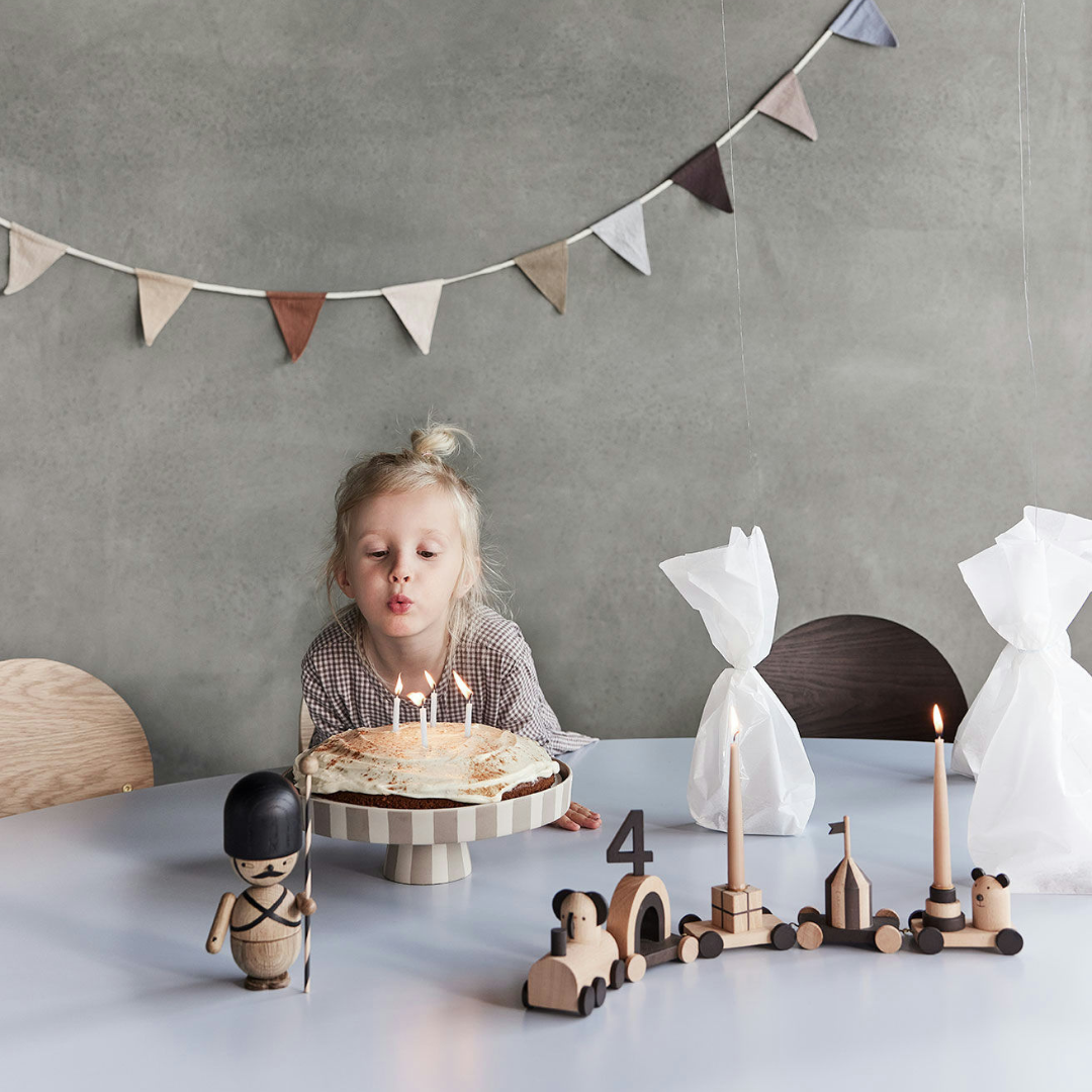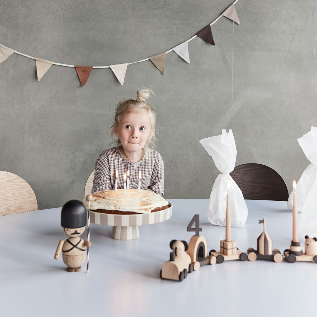 Gør fødselsdagen ekstra festlig med dette charmerende Otti fødselsdagstog fra OYOY KIDS. Toget er lavet i 100% naturligt FSC-certificeret birketræ, enten i farvet eller bejdset birk, og består af 1 lokomotiv, 4 vogne og 9 tal, der kan pyntes på bordet til fødselsdagsfesten.