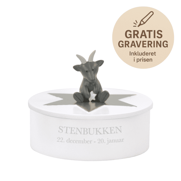 På dette smykkeskrin sidder Stenbukken på toppen. Den holder en lille stjerne der er malet med selvlysende maling. Stjernen lyser derfor fint op i mørket om natten. På siden står navnet på stjernetegnet, samt dato. Smykkeskrinet har et aftageligt låg og er indrettet med filt, samt et aftageligt skillerum i plexiglas.