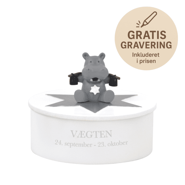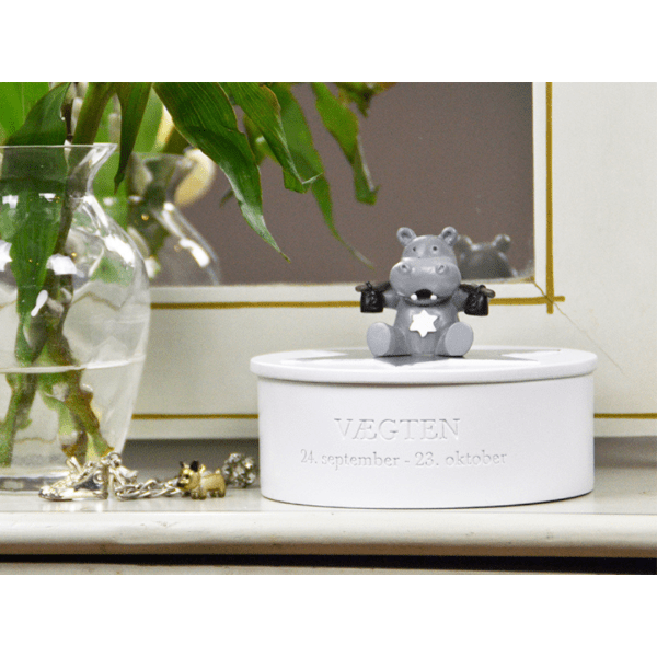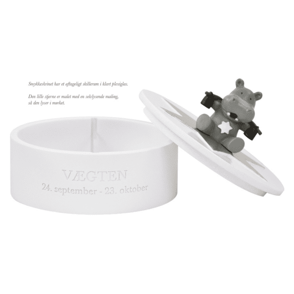 På dette smykkeskrin sidder Vægten på toppen. Den holder en lille stjerne der er malet med selvlysende maling. Stjernen lyser derfor fint op i mørket om natten. På siden står navnet på stjernetegnet, samt dato. Smykkeskrinet har et aftageligt låg og er indrettet med filt, samt et aftageligt skillerum i plexiglas.