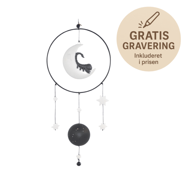 Hver uro/drømmefanger bærer på et stjernetegn, der gør den helt unik og personlig. Denne uro/drømmefanger har Skorpionen siddende på månen.