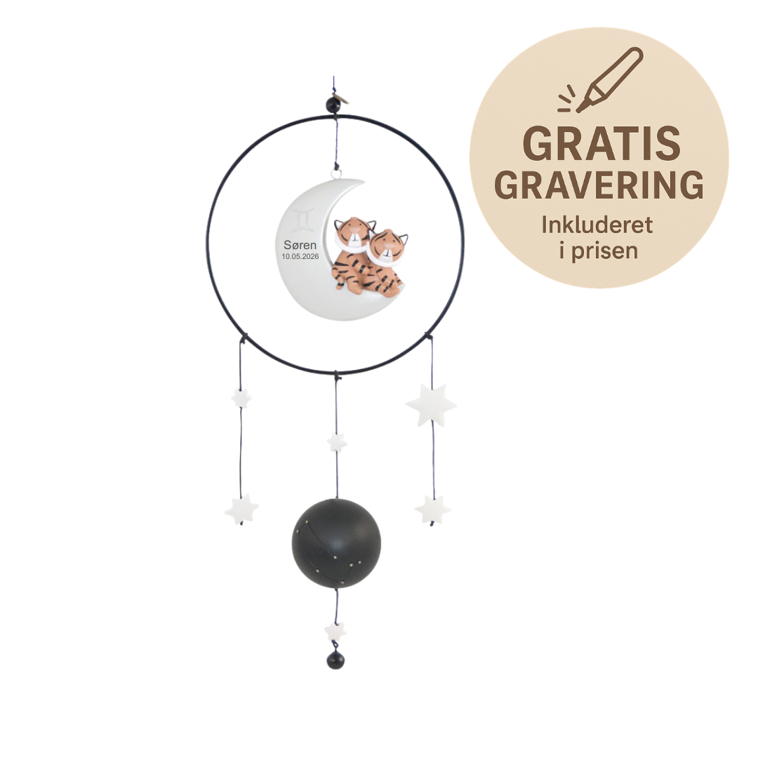 Hver uro/drømmefanger bærer på et stjernetegn, der gør den helt unik og personlig. Denne uro/drømmefanger har Tvillingen siddende på månen.