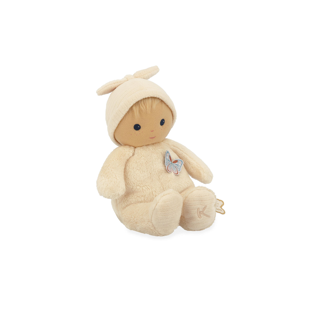 Baby Jasmine har grønne øjne, lyserøde pyjamas og et lille sommerfuglemotiv på maven, som giver et blidt og indbydende udtryk. Hun er lavet af ekstra blød mikrofleece og fløjl, mens fyldet består af genanvendt polyester, hvilket giver både komfort og omtanke i designet.
