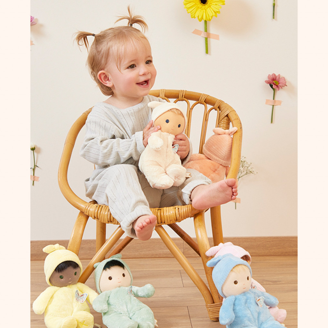 Mød Baby Jasmine, en kærlig og poetisk stofdukke skabt til at give tryghed, nærvær og bløde kram fra barnets allerførste dage. Hun er designet som en rolig og sanselig ven, der hurtigt bliver en fast del af både leg og putterutiner.
