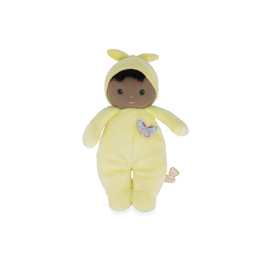 Baby Mimosa er skabt til at være en kærlig følgesvend fra livets begyndelse. Med sine grønne øjne, lyserøde pyjamas og lille sommerfugl på maven udstråler hun varme og poesi. Dukken er fremstillet i ekstra blød mikrofleece og fløjl med fyld af genanvendt polyester – perfekt til både kram og trøst.