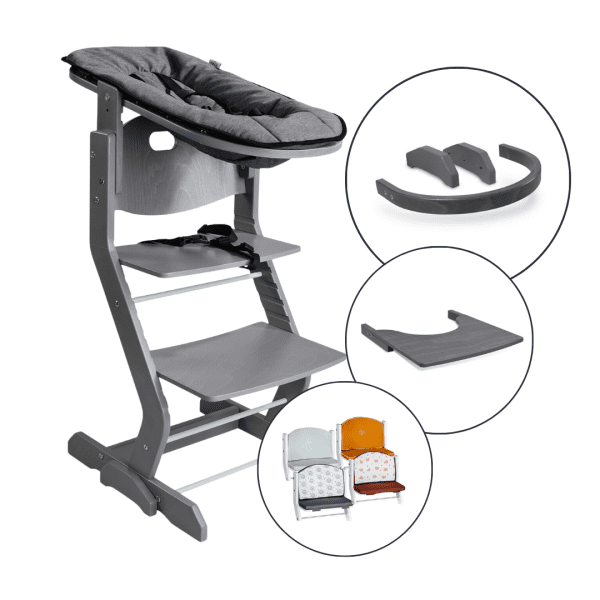Pakken indeholder en Tissi Højstol i farven grå – hertil medfølger en sele, spiseplade og bøjle så dit barn kan sidde trygt og sikkert og nyde måltiderne på egen hånd. Derudover medfølger en babyindsats, så baby kan være med ved bordet helt fra fødsel. For at give stolen lidt ekstra komfort, kan du tilvælge en sæde- og ryg hynde hvor du selv har mulighed for at vælge farve.
