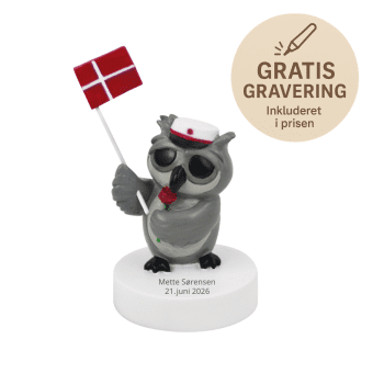 De håndmalede ugler er en personlig og unik gave, der med sit detaljerede design og plads til indgravering kan tilpasses helt efter dit ønske. Tilføj en gravering, og giv en gave, der vil blive værdsat i mange år fremover. Brug uglerne som pynt på bordet ved studentergildet eller som dekorative ophæng. Uanset hvor de placeres, spreder de glæde og minder om en stor milepæl i livet. Det aftagelige flag gør det nemt at tilpasse udseendet og anvendelsen.