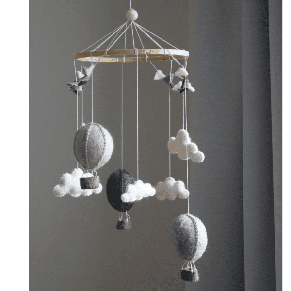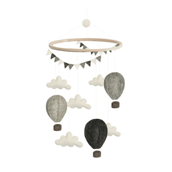 Denne smukke uro med luftballon og vimpler i fine grålige farver, som vil pynte på ethvert drenge- eller pigeværelse. Uroen er pakket med smukt bånd og er perfekt som gave til barselsgave, babyshower og dåbsgave.