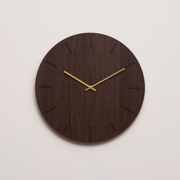 Et flot og enkelt vægur med en rund skive, som er skåret af mørkt egetræ. Årene træder tydeligt frem og varierer fra ur til ur, så hvert eneste er helt unikt. Urets mørke træ passer flot ind i ethvert moderne nordisk hjem og giver karakter til væggen. Du kan selv vælge, hvilken farve visere, du vil kombinere med det mørke træ, alt efter hvor meget de skal dominere.